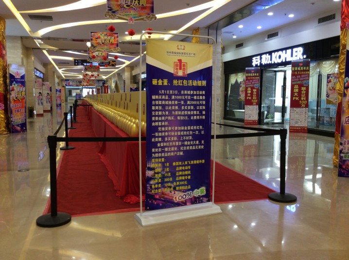 此次砸金蛋活动的气势颇大,商城直接将金蛋和红包布置在一楼金光大道,奖项设置也是颇为诱人。免单300元、品牌油烟机、电动车这些都是小菜一碟,还有特等奖泰国双人双飞浪漫境外游。